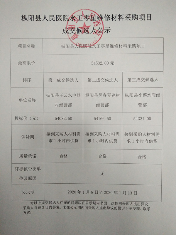枞阳县人民医院水工零星维修材料采购项目成交候选人公示