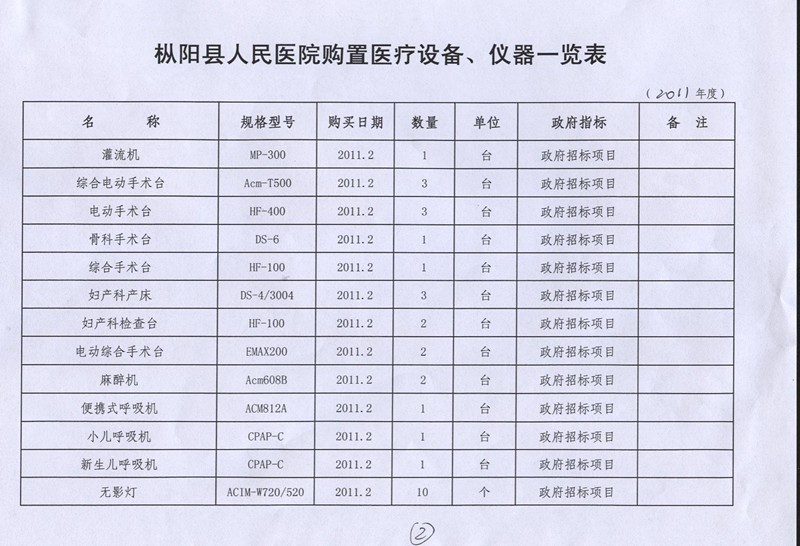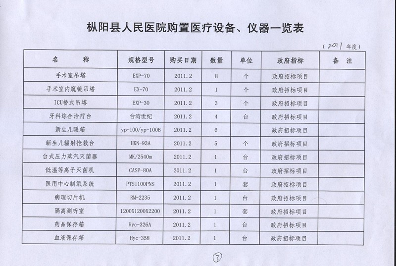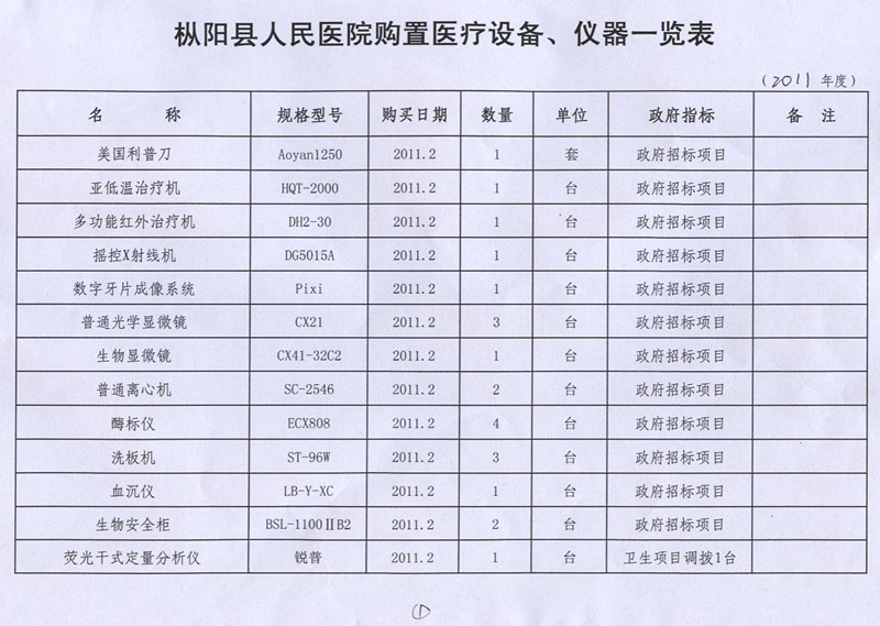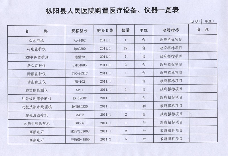 枞阳县医院2011年度购置医疗设备、仪器一览表: